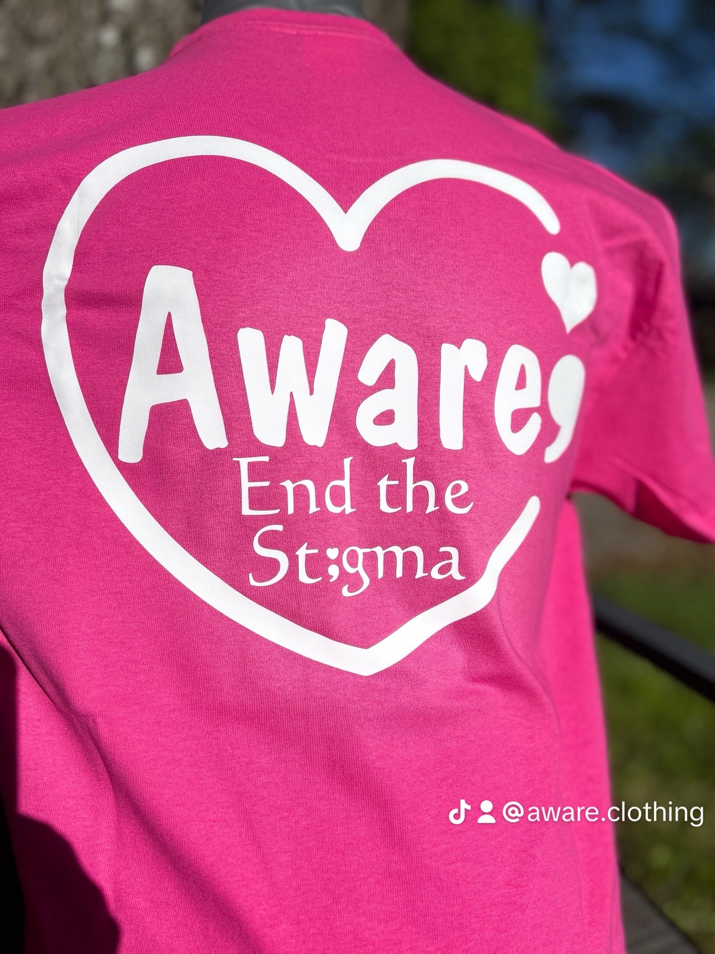 This t-shirt can be ordered in pink, red, yellow, green, military green, blue, purple, grey, or black t-shirt with a white design, large on the back and smaller on the left chest. The Aware logo is on the left sleeve and inside the collar is the number for the national suicide prevention hotline, which you may not need but someone you encounter might.