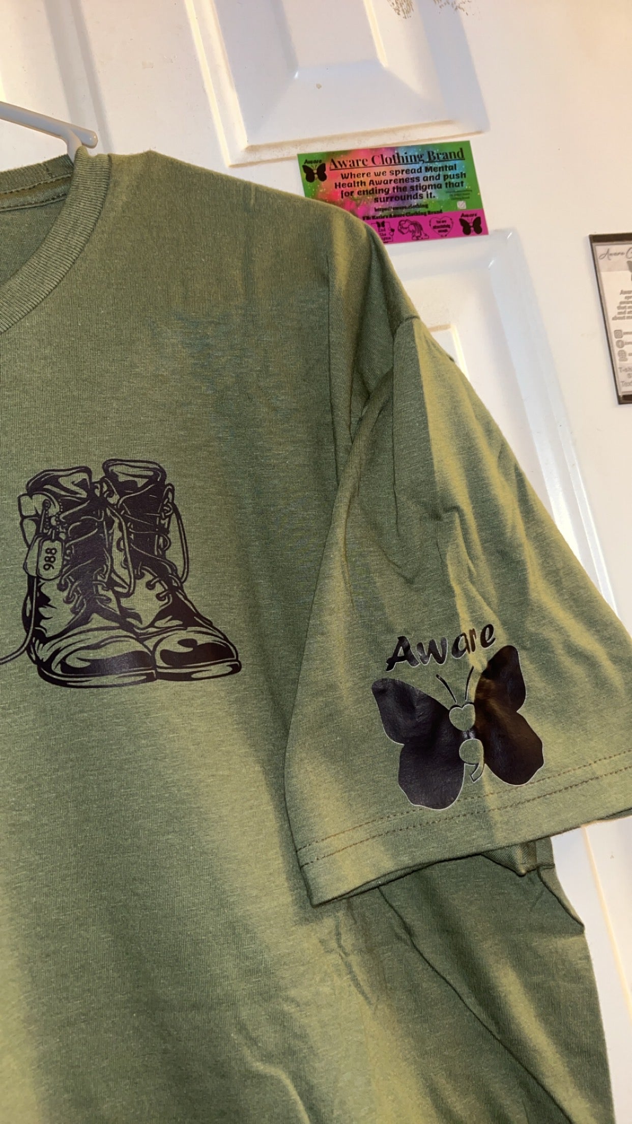 This t-shirt can be ordered in pink, red, yellow, Irish green, military green, royal blue, sand, or grey. Sizes Small to 5X. This design will be in black. There will be a large design on the back, small design on the left chest, and the Aware logo on the left sleeve. Inside the collar is the number for the national suicide prevention hotline, which you may not need but someone you encounter might.