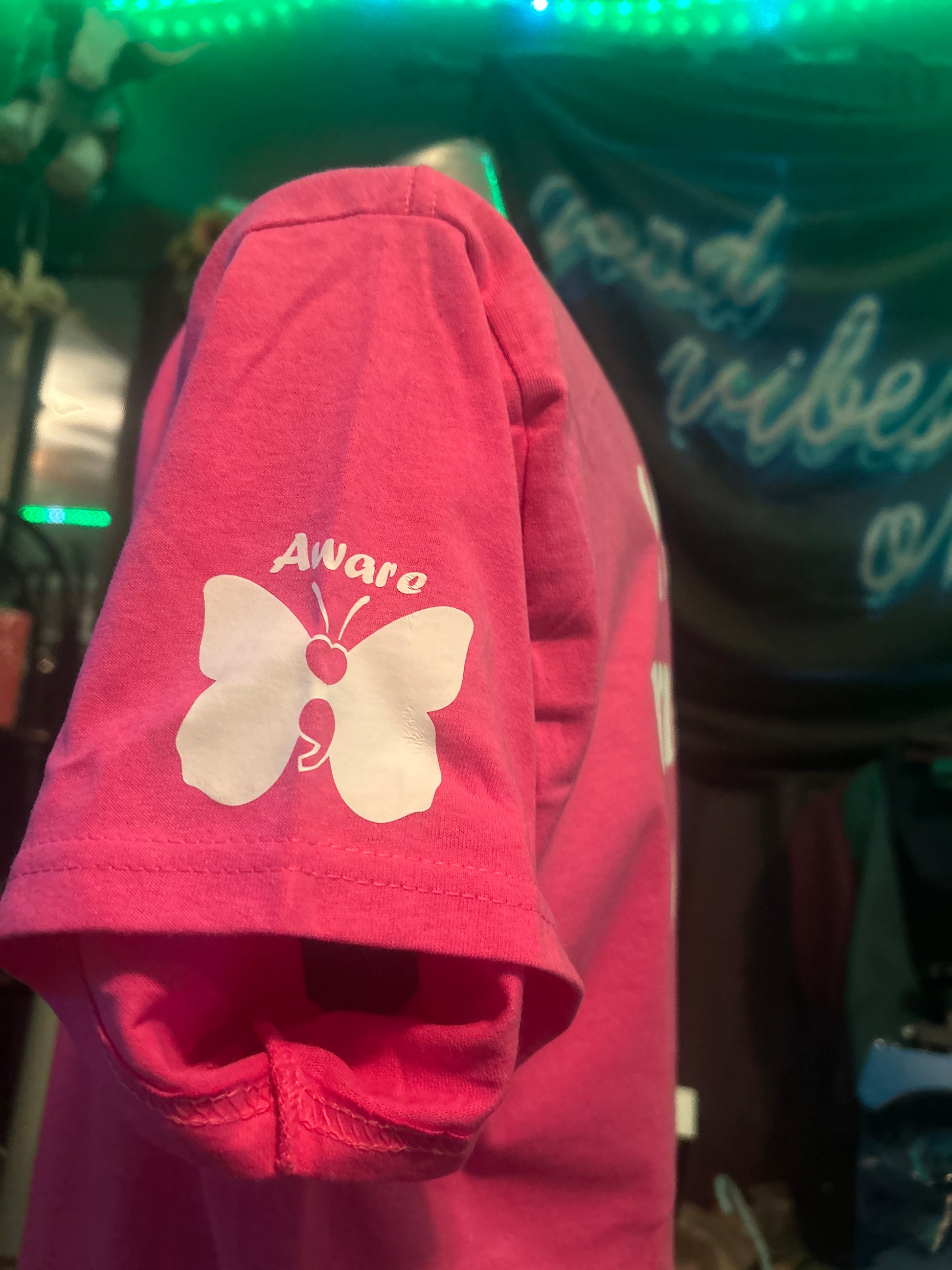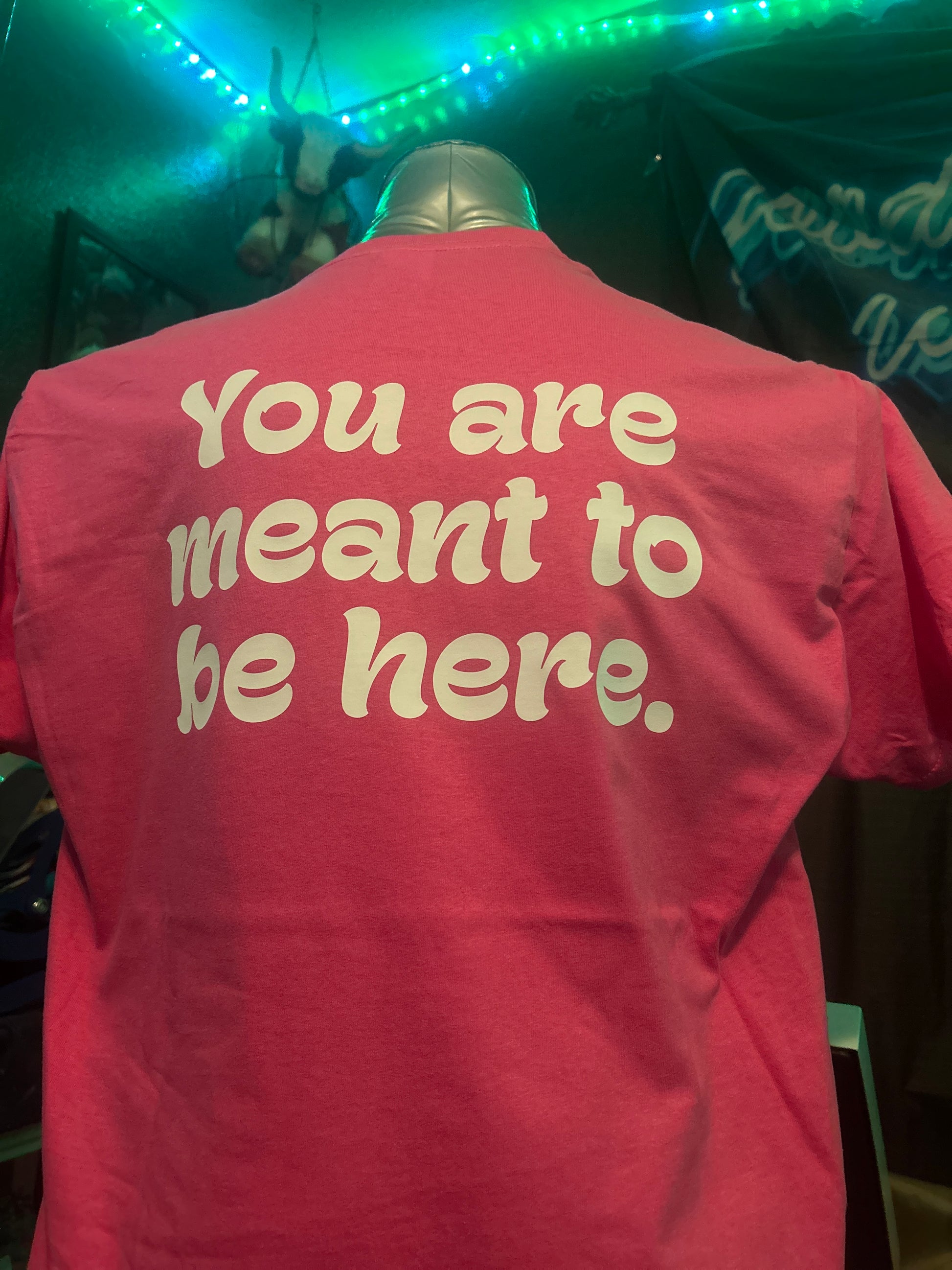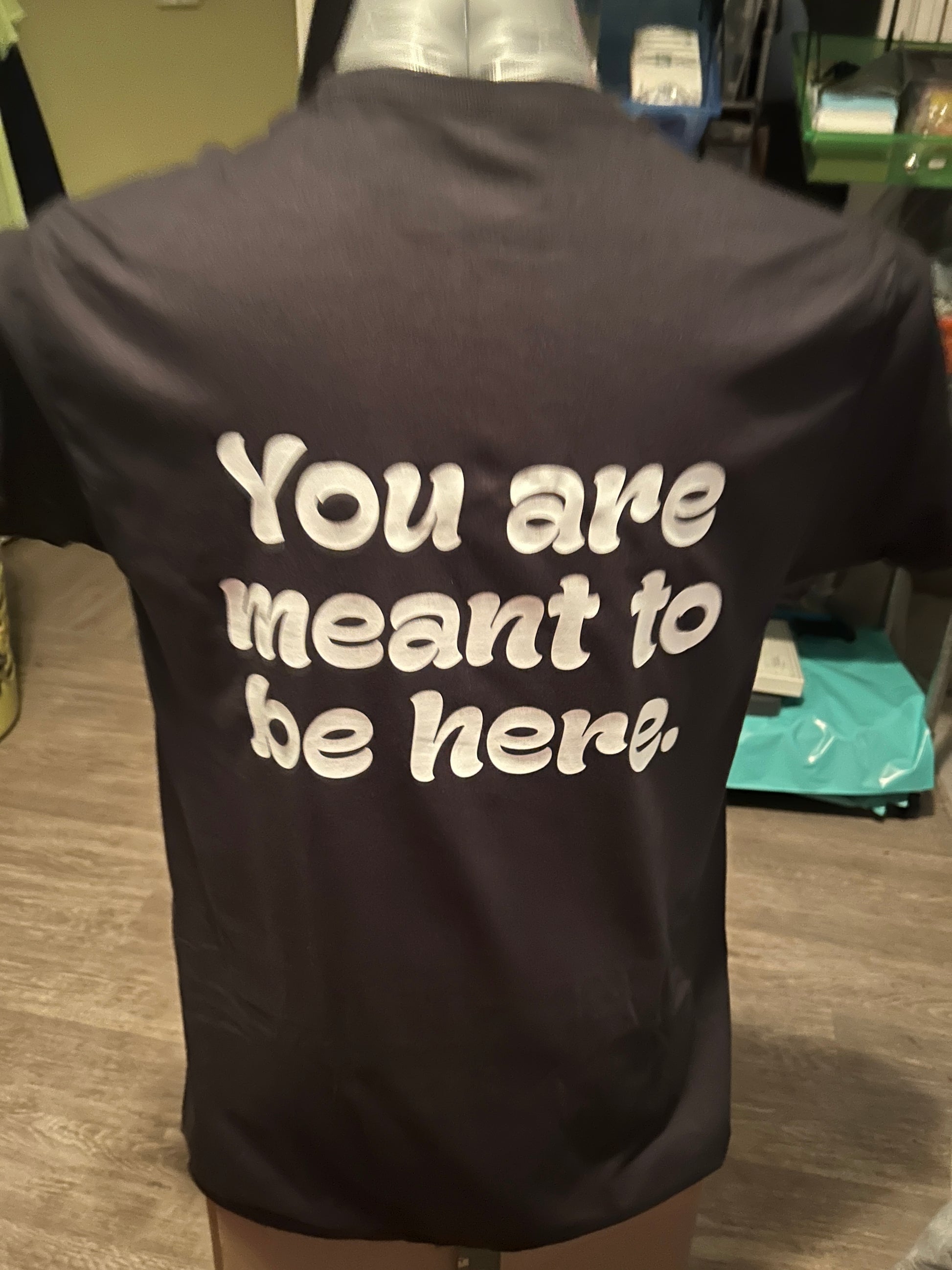 This t-shirt can be ordered in pink, red, yellow, Irish green, military green, blue, purple, charcoal gray, or black t-shirt with a white design, large on the back that says You are meant to be here and smaller on the left chest says you are absolutely enough. The Aware logo is on the left sleeve and inside the collar is the number for the national suicide prevention hotline, which you may not need but someone you encounter might.