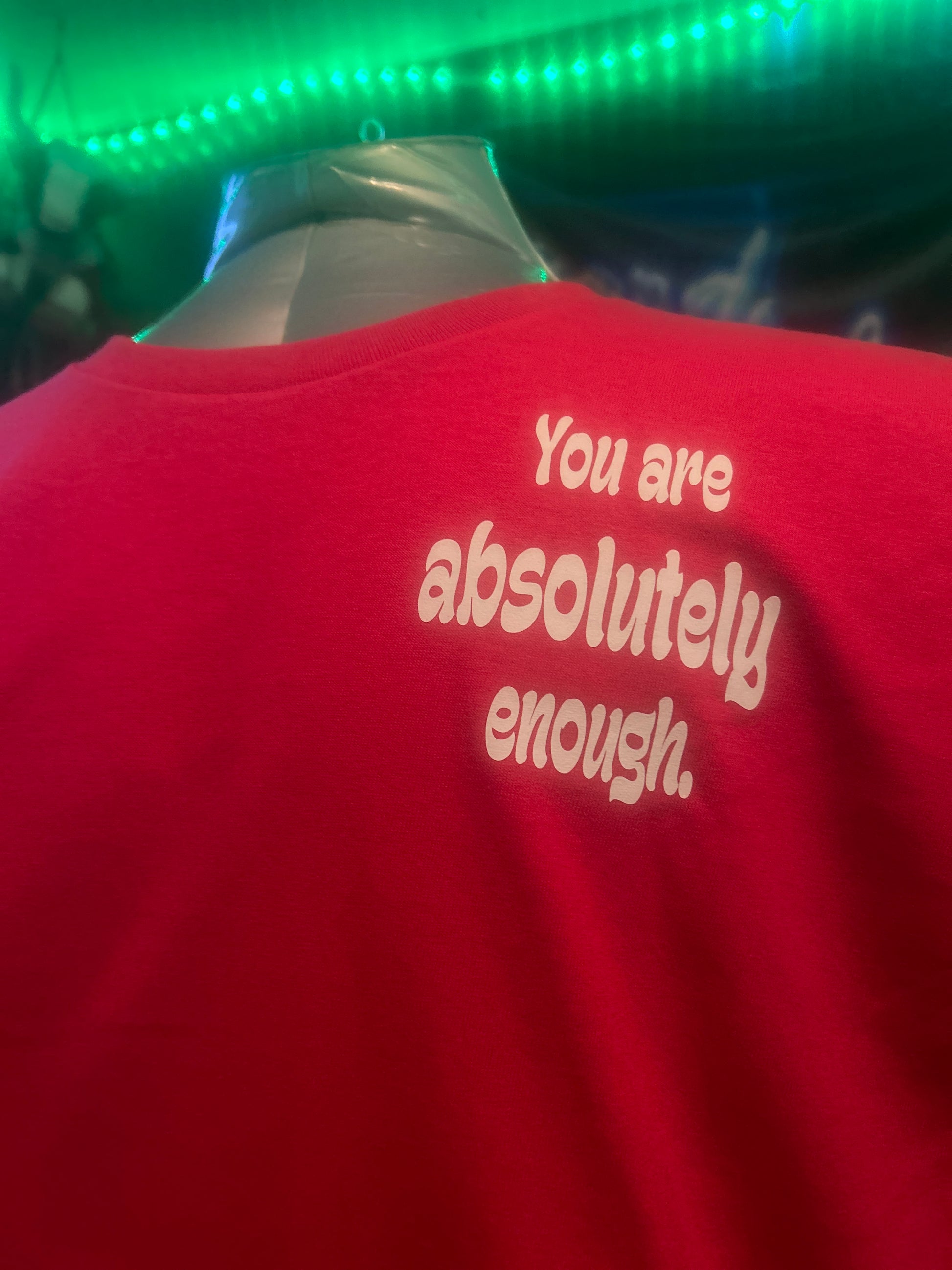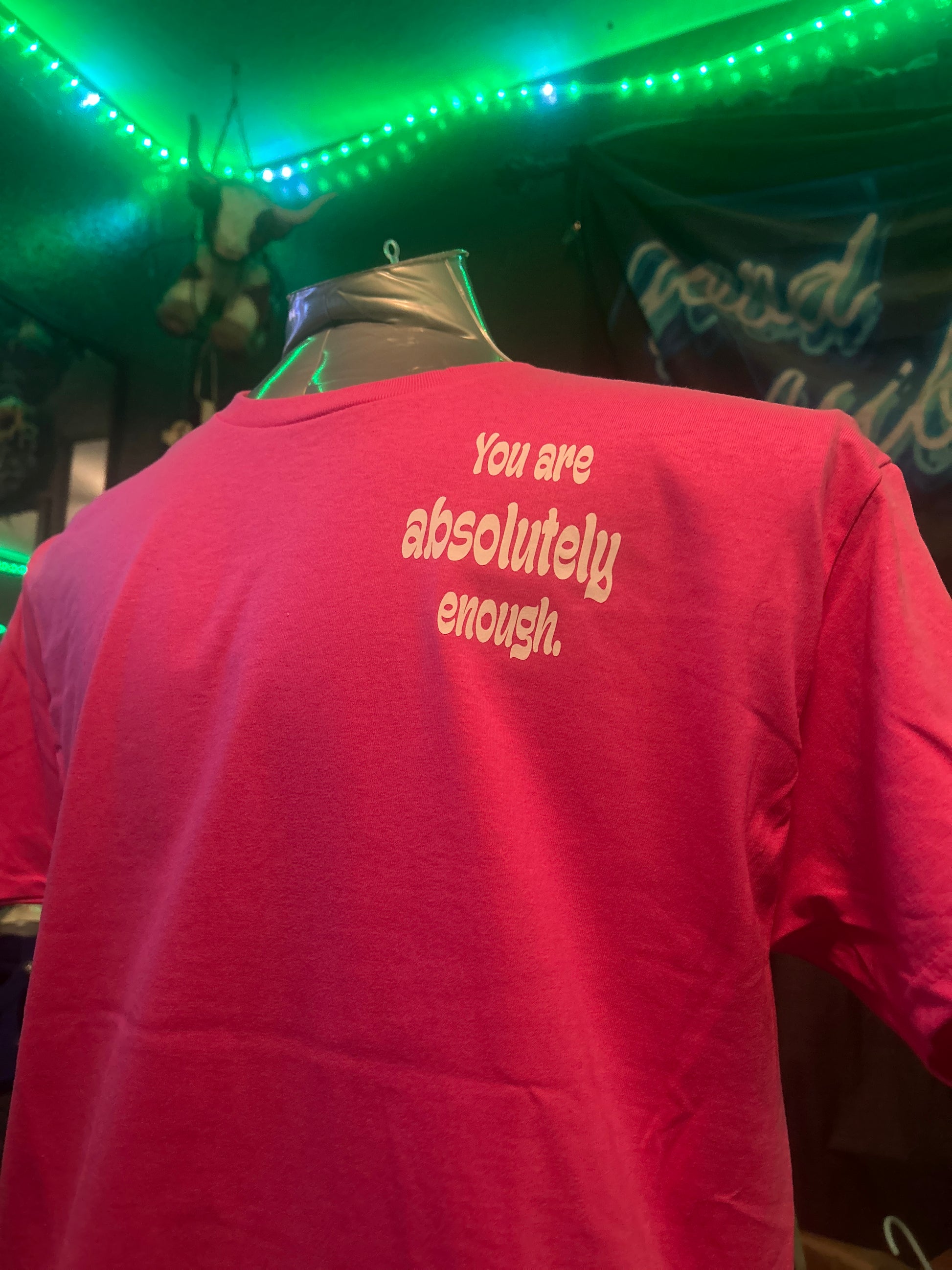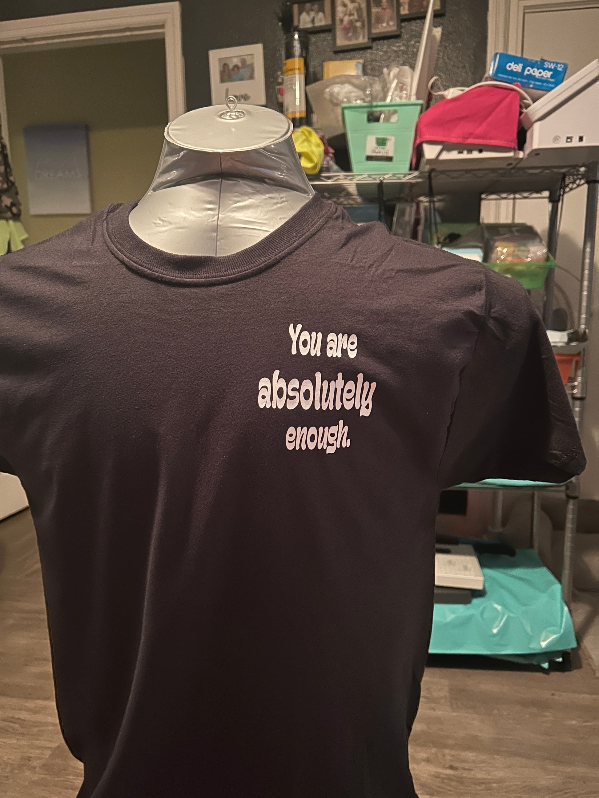 This t-shirt can be ordered in pink, red, yellow, Irish green, military green, blue, purple, charcoal gray, or black t-shirt with a white design, large on the back that says You are meant to be here and smaller on the left chest says you are absolutely enough. The Aware logo is on the left sleeve and inside the collar is the number for the national suicide prevention hotline, which you may not need but someone you encounter might.