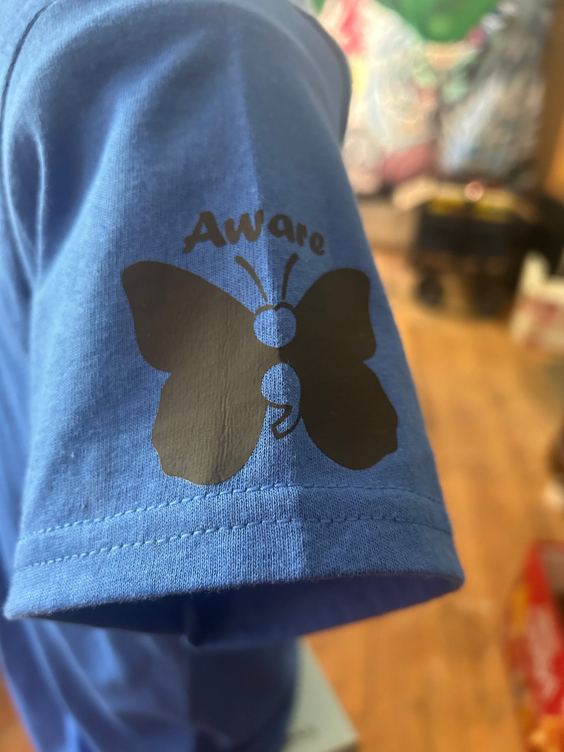 This t-shirt can be ordered in dark grey, sand, olive green, or blue t-shirt with a black design, large on the back and smaller on the left chest. The Aware logo is on the left sleeve and inside the collar is the number for the national suicide prevention hotline, which you may not need but someone you encounter might.