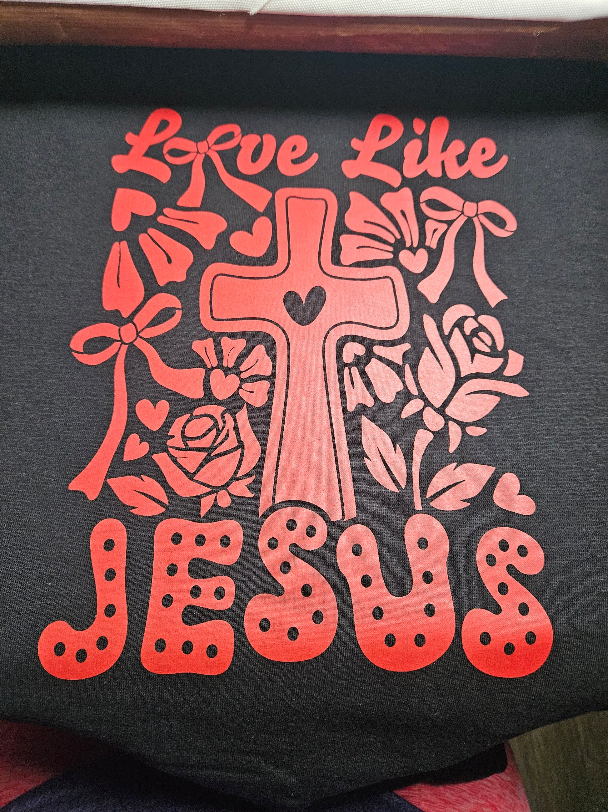 Love like Jesus- design available in limited quantities. Size small to XL: t-shirt $18, sweatshirt $25 or hoodie $35. Size 2x to 4x t-shirt $22, sweatshirt $30, or hoodie $40. This is a red screen print design. Will Come on a Comfort Color T-shirt. Sweatshirt and hoodie will vary on the brand but promises to be very comfortable.