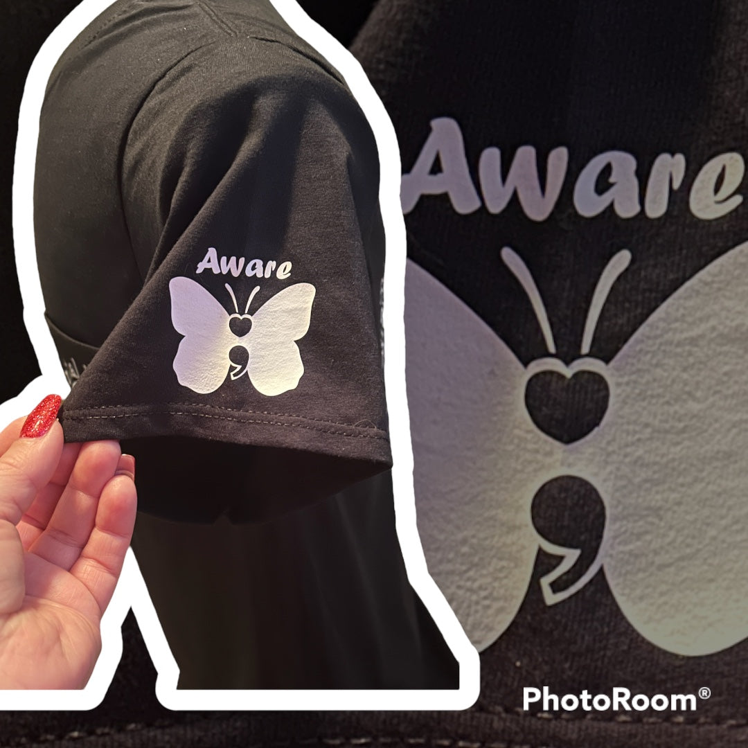 This Aware t-shirt can be ordered in sizes XS to 5X. Color of shirt can be black, grey, blue, olive, or sand. Design will be black or white to pop on the color of the t-shirt. Comes with a large design on the back and smaller design on the left chest. The Aware logo is on the left sleeve and inside the collar is the number for the national suicide prevention hotline, which you may not need but someone you encounter might.