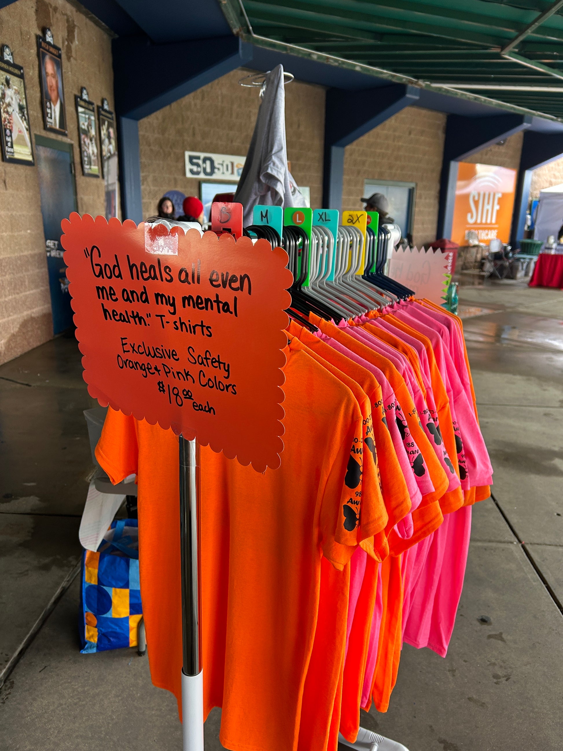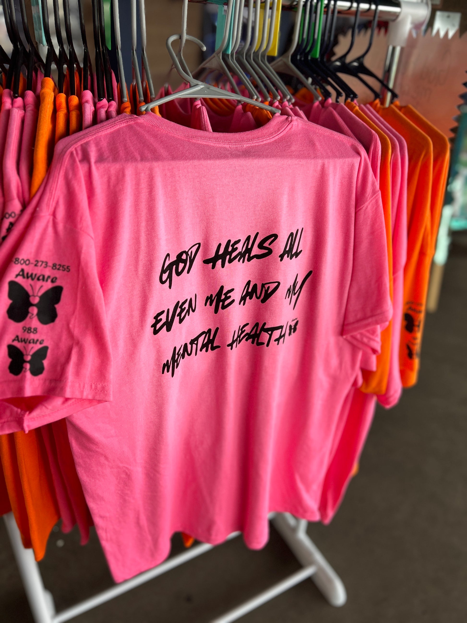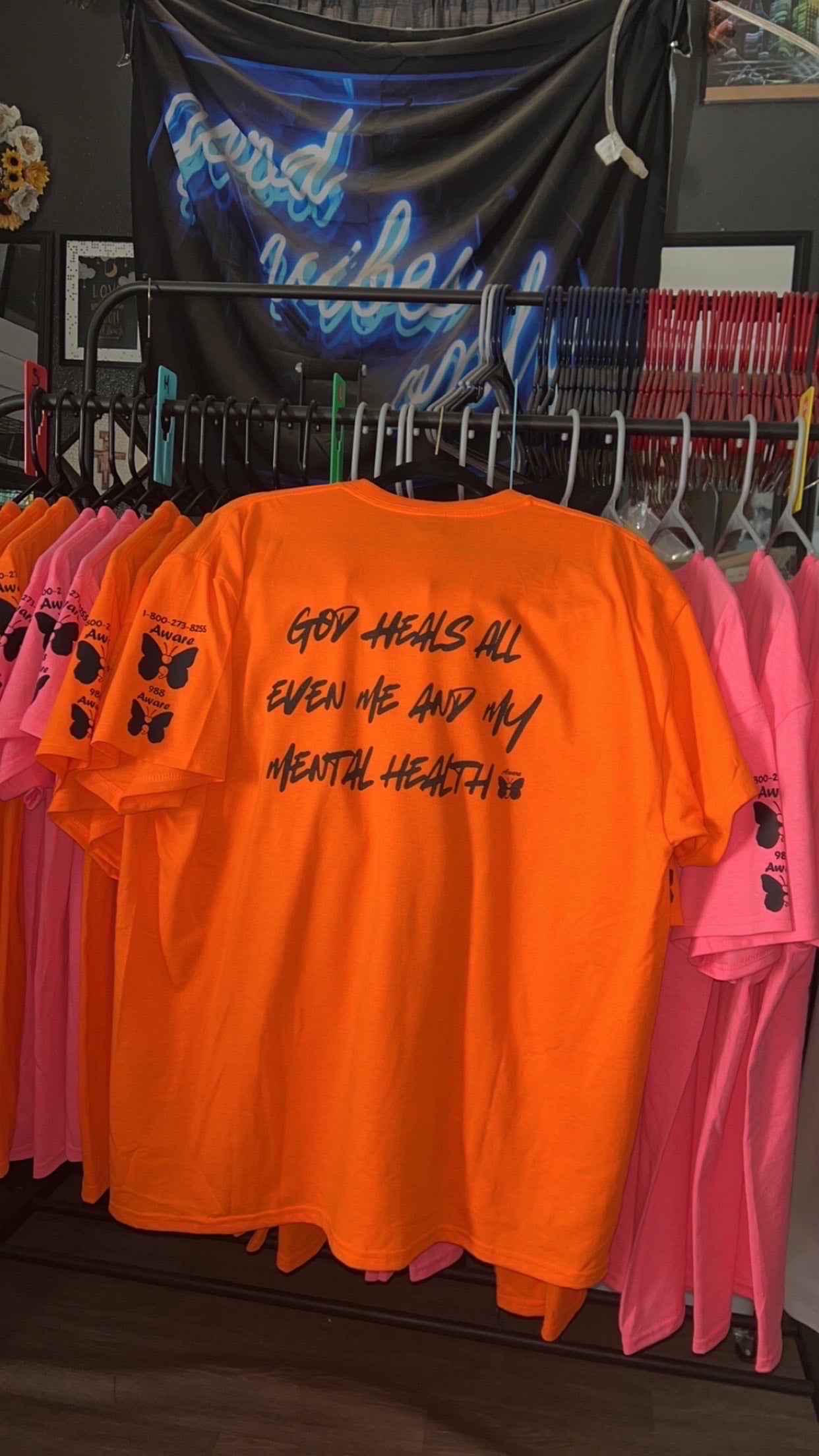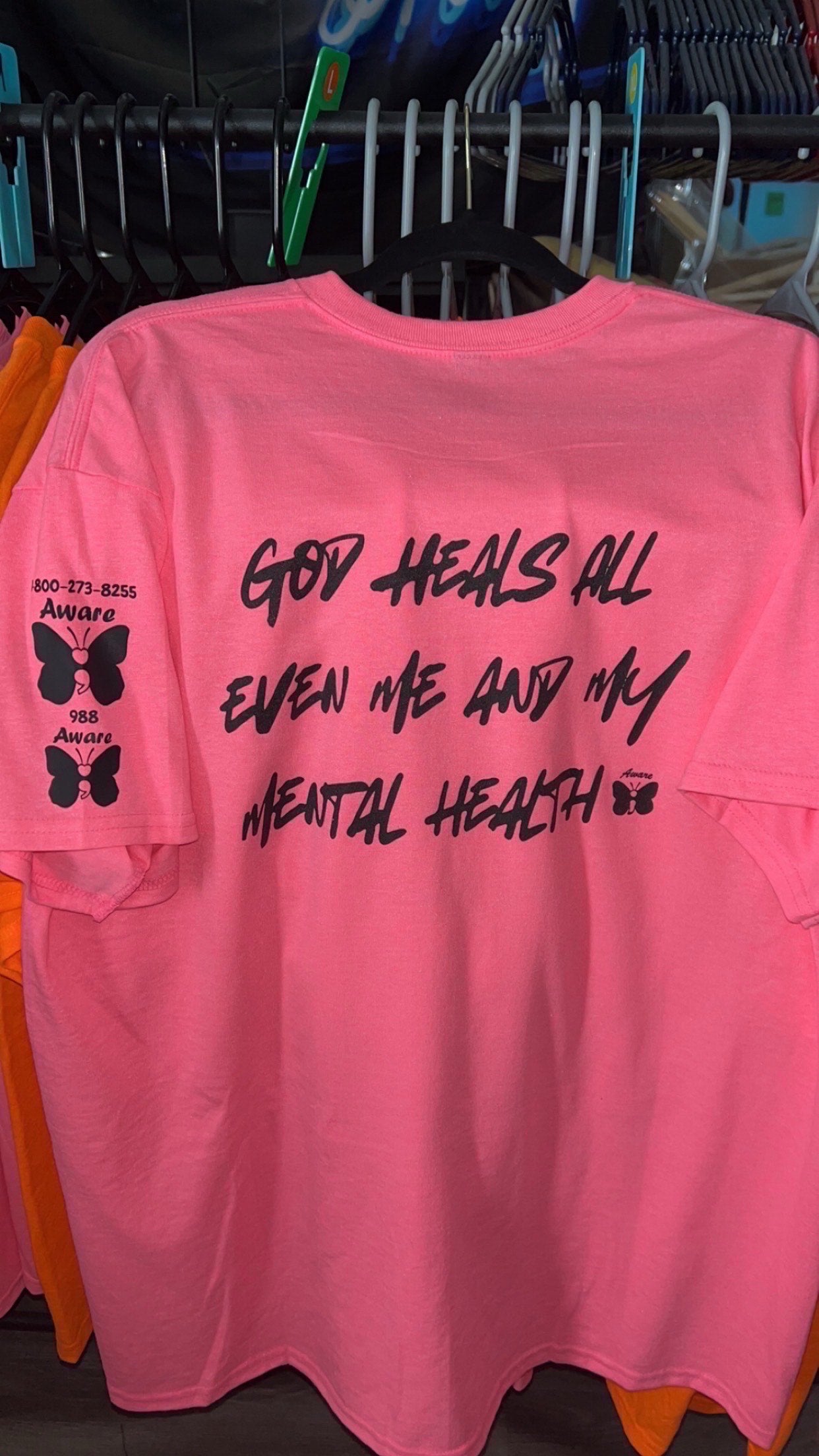 This is an original design "God heals all even me and my mental health" and is available in Size small to XL: t-shirt $15. Size 2x to 4x t-shirt $20. This is a DTF transfer design on safety colors to stand out and shine bright on a Softstyle shirt. Sale price until they sell out.
