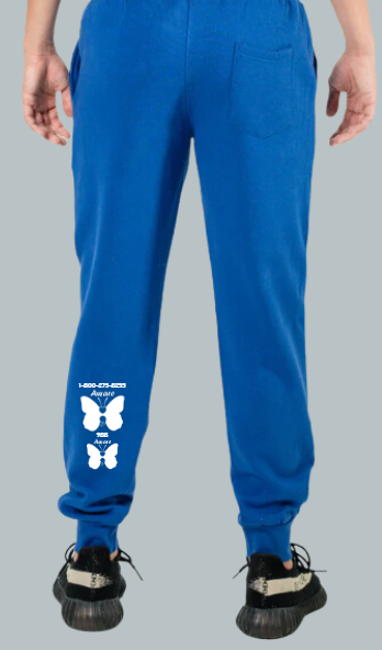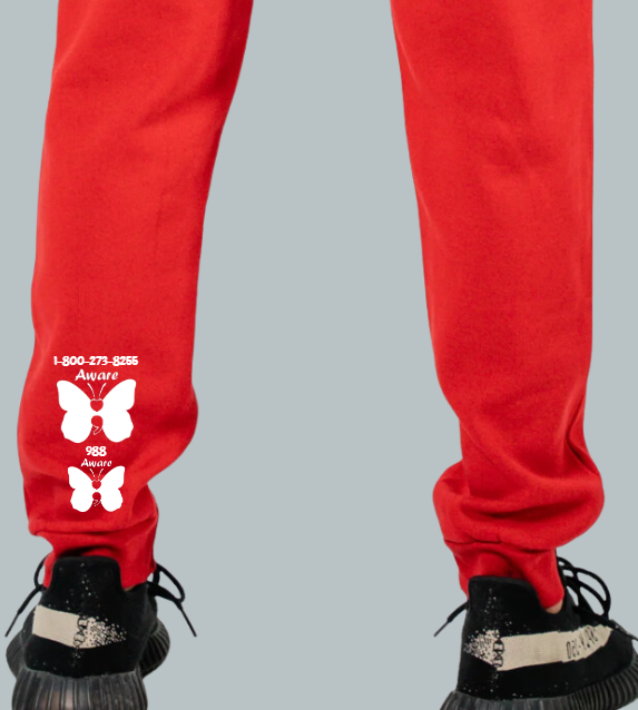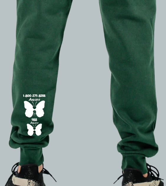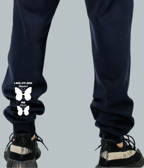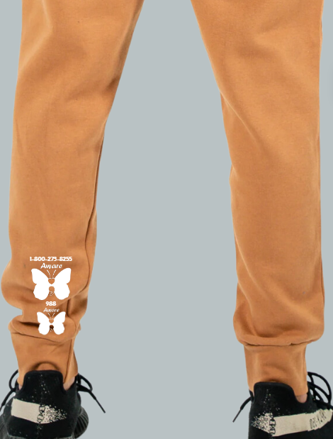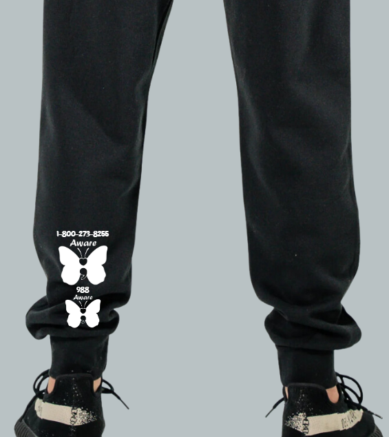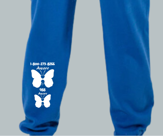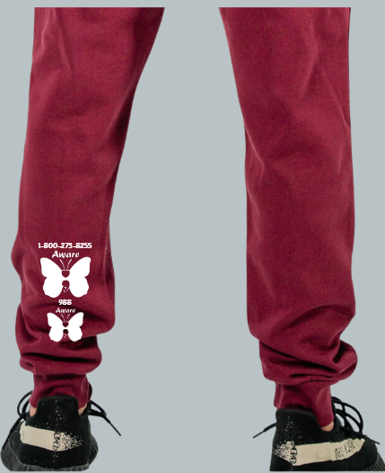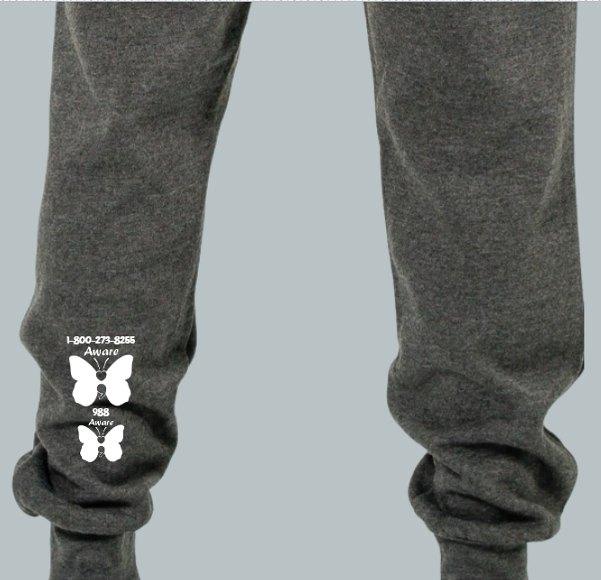 These Joggers can be ordered in size small to 2X. Colors available are red, green, royal, navy, maroon, grey, camel, or black. These are men’s sizes and very comfortable joggers with pockets. The design is white and on the left thigh, on the back of the left leg will be a double logo along with the National Suicide Prevention Hotline number just in case someone needs it.